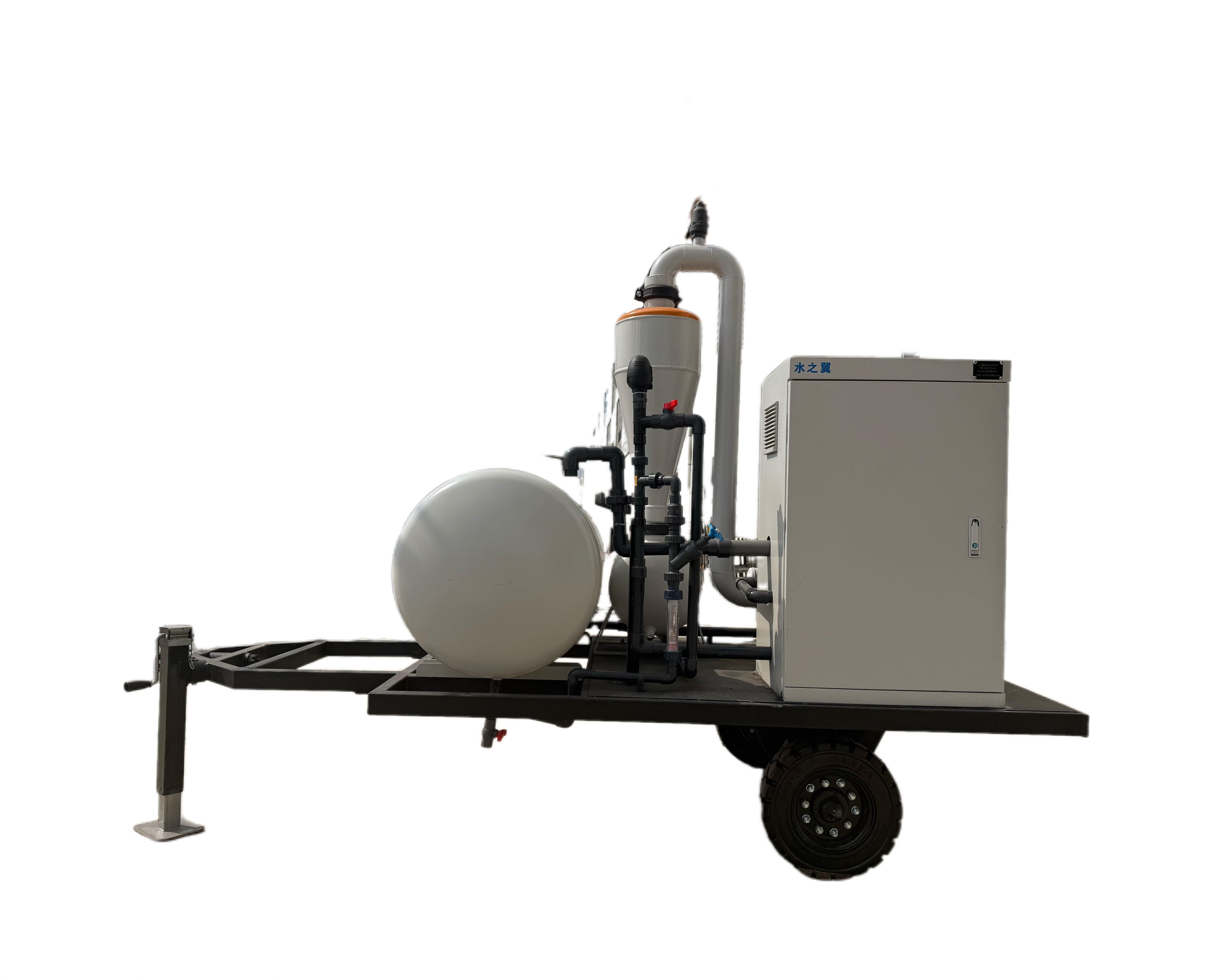 设备必须在一个坚实可靠的水平面上停放平稳。并配备一台符合流量扬程需求的水泵,将三相380V交流电接入设备进线端子。